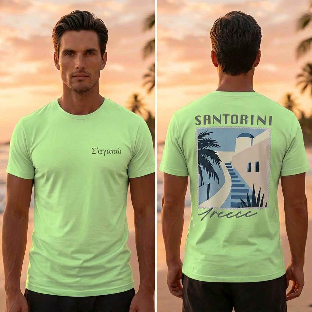 Greek Santorini Light Green T-Shirt – Summer Travel Graphic Tee for Men